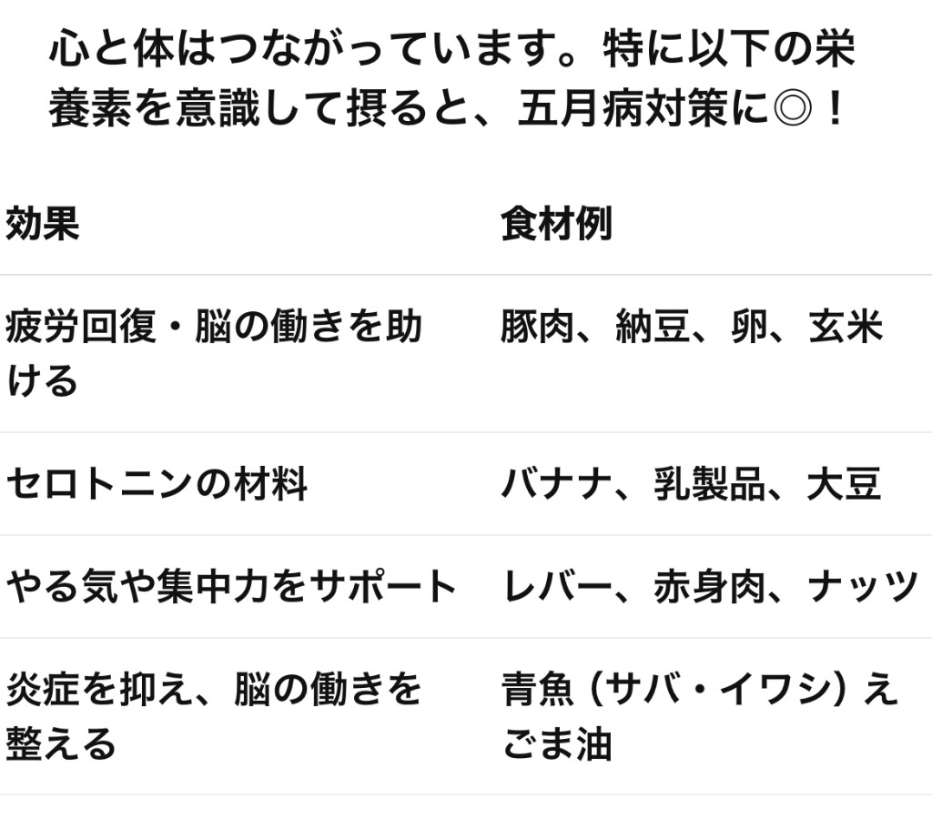 心と体はつながっています。特に以下の栄養素を意識して摂ると、五月病対策に◎!