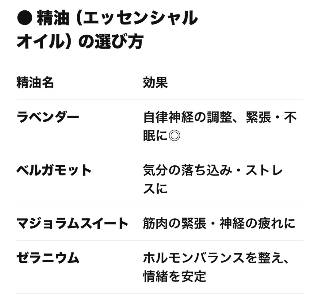 • ラベンダーやベルガモットなどのアロマオイルはリラックス効果が高く、心を落ち着かせてくれます。